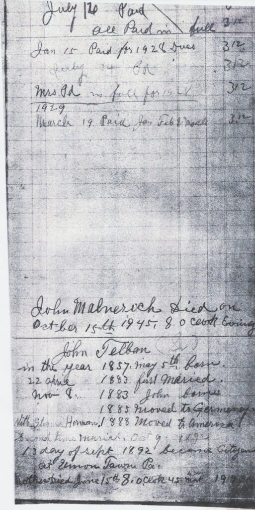 John married Ivana ‘Johanna’ Treven and had three children with her, John William Jr, Mary Elizabeth and Pauline (Polly). His first wife Johanna was born in 1862 and do not have the exact date of birth and she died December 22, 1891 in Pennsylvania.